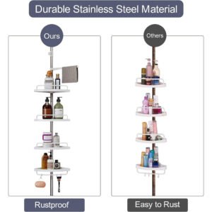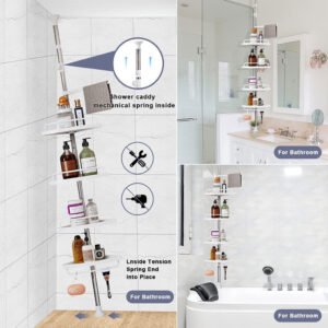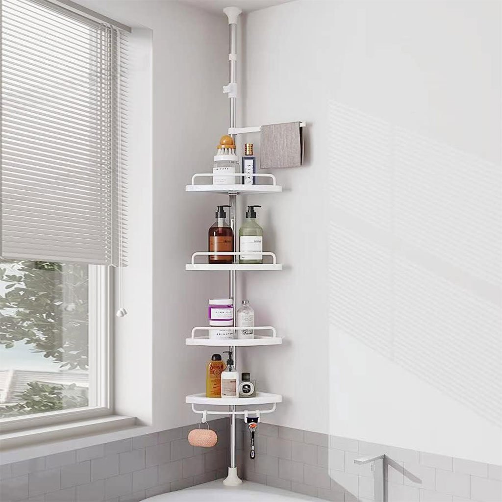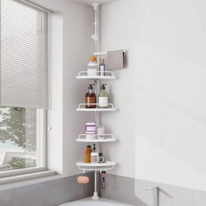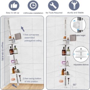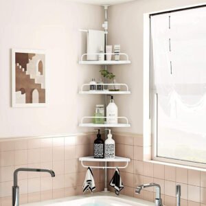 رفوف الزاوية للحمام 320 سم هي حل تخزين عملي لإنها مثالية لتنظيم مستلزمات الحمام الخاصة بك ، مثل الشامبو والصابون والبلسم والمناشف في زاوية الحمام.