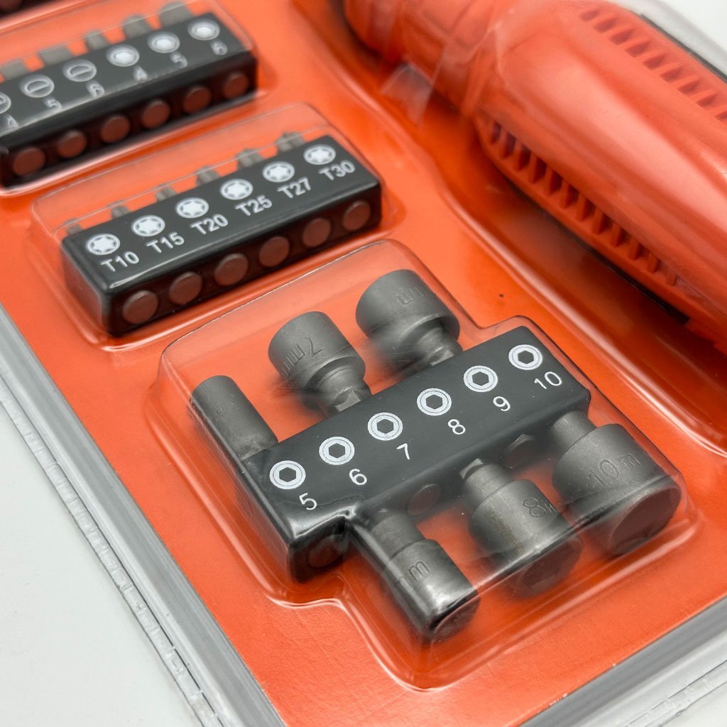 🔧 طقم مفكات براغي مع آلية كليكات SOMAFIX SFX5358مصمم خصيصًا للمحترفين وعشاق الأعمال اليدوية. مصنوع من فولاذ الكروم فاناديوم (Cr-V) المعروف بصلابته العالية، هذا الطقم المكون من 25 قطعة يضمن لك أداءً موثوقًا وطويل الأمد في جميع أعمال الفك والربط.⭐ المميزات الرئيسية :✔️ مفك كليكات بتصميم مريح مع مقبض مانع للانزلاق لراحة مثالية أثناء الاستخدام ✔️ يحتوي على 25 رأس دقيق تشمل :PH1, PH2, PH3PZ1, PZ2, PZ3T10 إلى T304mm, 5mm, 6mm ✔️ تنظيم واضح للرؤوس مع ترقيم لتسهيل الوصول السريع ✔️ مصنوع من فولاذ Cr-V المقوى: أقوى مرتين من الفولاذ العادي ✔️ مثالي للأعمال الميكانيكية، الإلكترونية، والصيانة المنزلية ✔️ أداة لا غنى عنها لمن يبحث عن الكفاءة، المتانة، والدقة في تصميم مدمجDimensions : 20cm.