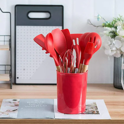 - مجموعة أدوات مطبخ: 12 قطعة من أدوات المطبخ المصنوعة من السيليكون تشمل: 4 ملاعق ، ملعقة مشقوقة ، ملعقة مشقوقة ، ملعقة تقديم المعكرونة ، فرشاة ، خفق ، ملقط. مع قاعدة لجميع احتياجاتك للطهي.