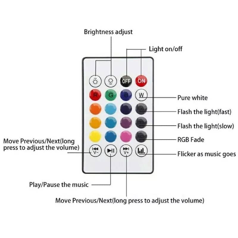 لمبة LED بلوتوث مع سماعة موسيقية (E27)الخامة: بلاستيك.لون الهيكل: أبيض.لون الإضاءة: RGB.الطاقة: 12 واط (LED 7 واط + سماعة 5 واط).التردد: 135 هرتز – 15 كيلوهرتز.إصدار البلوتوث: 3.0، بمدى يصل حتى 10 أمتار.الحجم: تقريباً 9.4 × 13.2 سم.طريقة الاستخدام:تثبيت اللمبة على قاعدة E27 وتشغيلها.التحكم في الألوان والمودات عبر الريموت.توصيل البلوتوث من الهاتف أو الجهاز اللوحي لتشغيل الموسيقى.المرفقات: لمبة LED بلوتوث + ريموت تحكم بـ 24 زر.