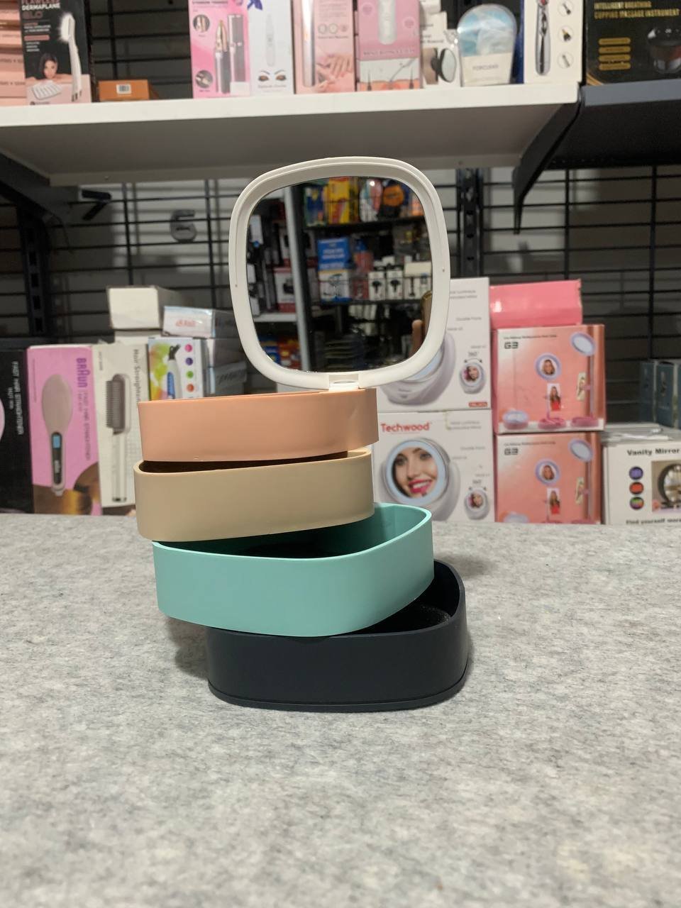 عرض المنتج: علبة مجوهرات متعددة الوظائف مع مرآة دوارةالمادة: ABSالوظائف: دوران، تصميم متعدد الطبقات مع تقسيم داخليالنمط: عصري وبسيطالأبعاد : 12x12cm.