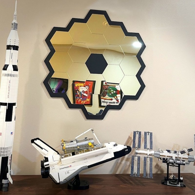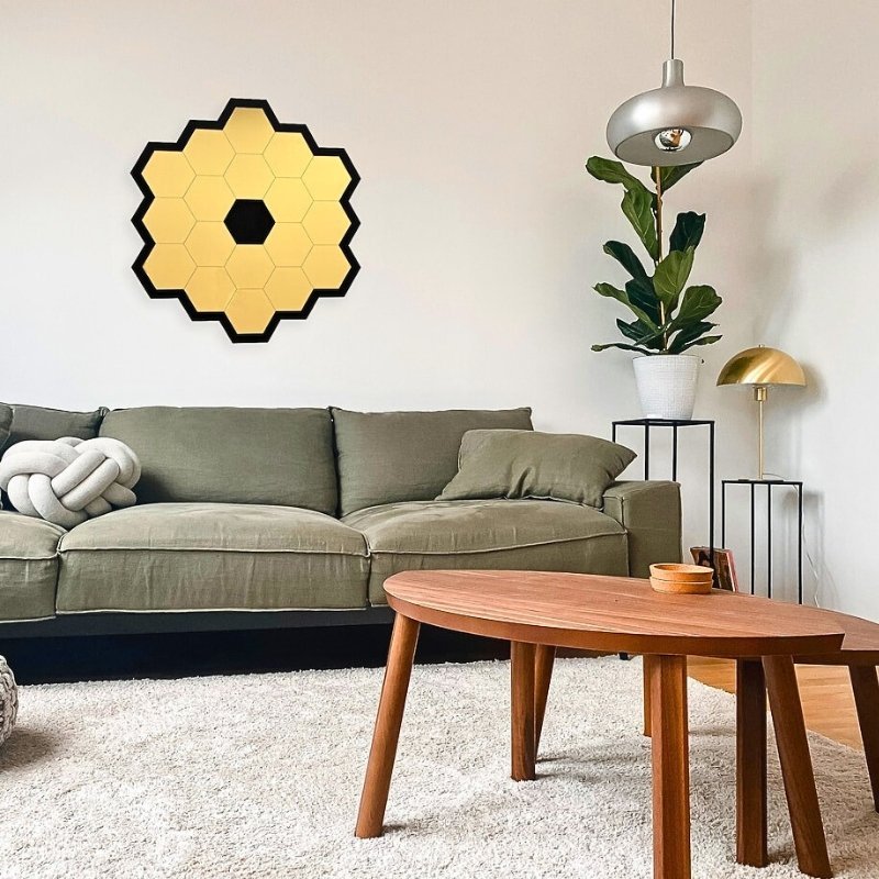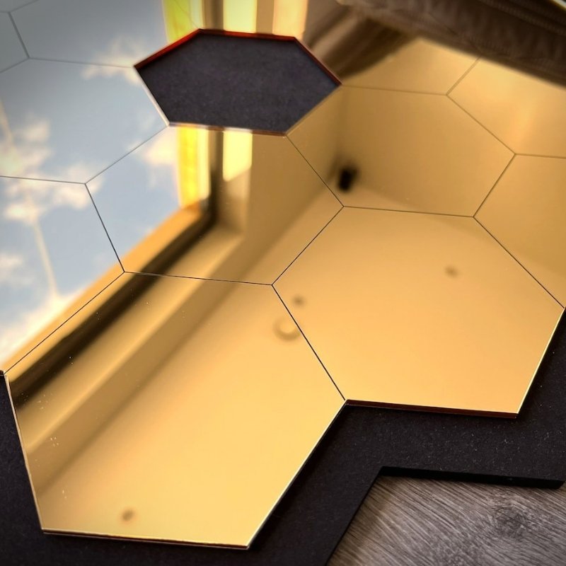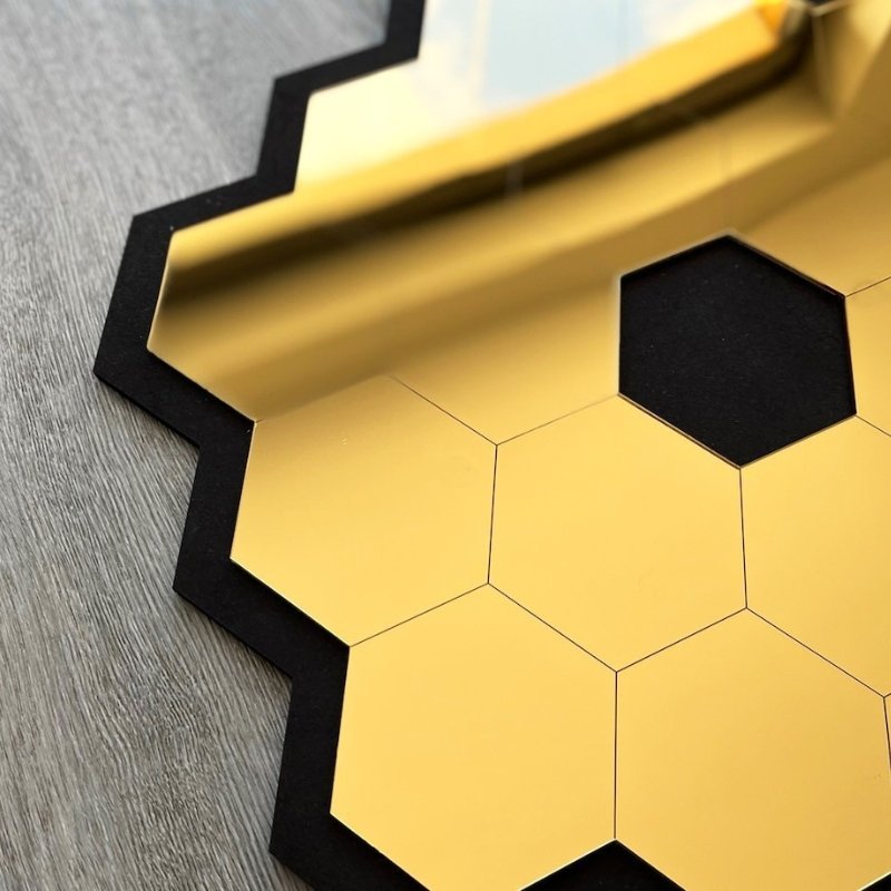 مرآة زخرفية سداسية مستوحاة من تلسكوب جيمس ويبمصنوعة من بلاكسي جلاس عالي الجودة آمن وغير قابل للكسر.انعكاس شديد اللمعان يضفي إشراقة مميزة على الجدران.جاهزة للصق مباشرة بفضل الشريط اللاصق المزدوج.قياس: 40 سم × 45 سم.يأتي مع مرآة إضافية صغيرة يمكن لصقها بالداخل.تصميم أنيق يضفي لمسة عصرية للمنازل ويعكس ضوء الشمس بشكل جميل ليبرز كقطعة ديكور فريدة.هدية مثالية للأصدقاء والعائلة الذين يحبون الديكورات المميزة.