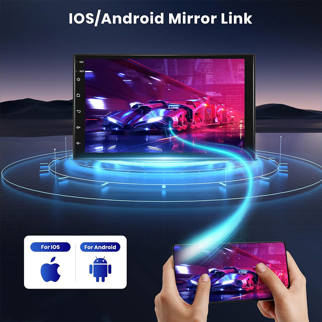 مسجّل سيارة 7 بوصة بشاشة لمس (2DIN) مع كاميرا خلفيةأبعاد التثبيت: 178 × 102 × 52 مم مع منفذ طاقة ISO ودعم DAB+/OBD2/DVR.وظيفة Mirror Link: لعرض شاشة الهاتف على شاشة المسجّل عبر USB أو WiFi لاستخدام الملاحة، الفيديو والموسيقى.اتصال Bluetooth وراديو FM: مكالمات بدون استخدام اليدين وتشغيل الموسيقى مع 18 محطة راديو مسبقة الإعداد.دعم الشاشة المزدوجة: عرض خريطة الملاحة وتشغيل الموسيقى في وقت واحد.كاميرا رجوع وتحكم بالمقود: تعرض صورة الرجوع للخلف تلقائياً، ويمكن التحكم بالوظائف عبر عجلة القيادة لراحة وأمان أكبر.الأبعاد : 17.5×10.5×6.5cm (7pouces)
