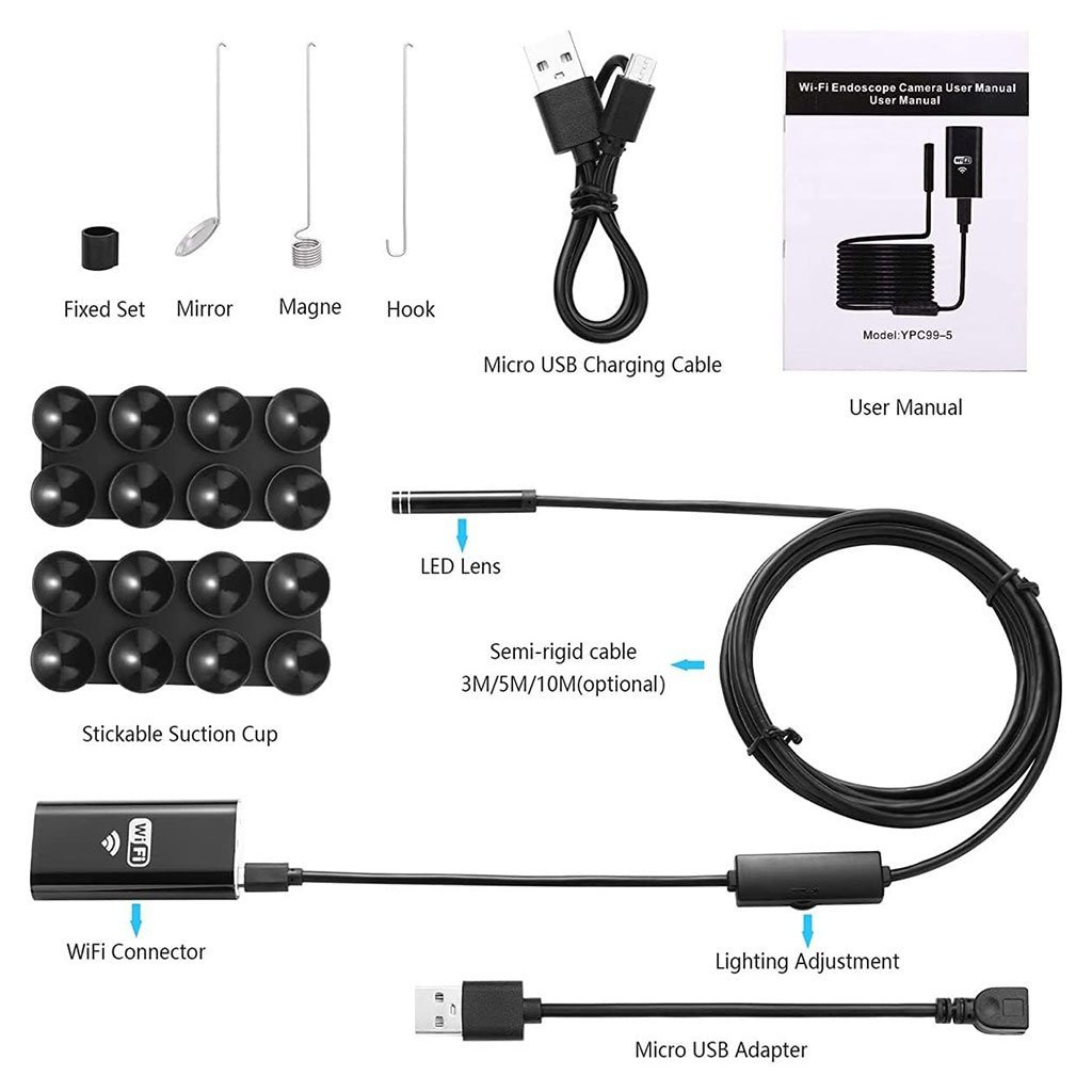 🔍 منظار واي فاي ذكي متعدد الاستخدامات – استكشف ما لا تراه عيناك! 📱💡⚙️ توافق واسع مع جميع الأجهزة يعمل هذا المنظار اللاسلكي بتقنية WiFi مع أنظمة Android / iOS / iPad / Windows. مزود بكابل شبه صلب قابل للانحناء، يمكنه الوصول بسهولة إلى أضيق الزوايا داخل منزلك أو سيارتك أو الأجهزة الإلكترونية 🧰.📡 اتصال WiFi سهل الاستخدام لا حاجة لأي أسلاك أو محولات إضافية! قم فقط بتنزيل التطبيق، ثم اتصل بالمنظار عبر WiFi وابدأ المعاينة مباشرة من هاتفك 📲.🎥 كاميرا دقيقة بدقة HD 2.0 ميغابكسل التقط صورًا ومقاطع فيديو عالية الوضوح بجودة 720P مع إمكانية التبديل بين دقات مختلفة (640×480 / 1280×720). مزود ببطارية ليثيوم 800mAh تدوم حتى ساعتين من العمل المتواصل 🔋.💧 مقاوم للماء IP67 وعدسة بقطر 8 مم مثالي للاستخدام في الأنابيب، المصارف، الجدران، مكيفات الهواء، الأماكن الرطبة والمظلمة. يحتوي على 8 مصابيح LED قابلة للتعديل تمنحك رؤية واضحة حتى في العتمة التامة 🌑.طول الكابل : 100سم.🧲 3 ملحقات عملية مدمجة🔍 مرآة صغيرة: لتفقد الأماكن الضيقة🧲 مغناطيس: لالتقاط القطع المعدنية🪝 خطاف: لسحب الأشياء الصغيرة من الأماكن الصعبة📐 المواصفات التقنية📸 دقة الكاميرا : 200W / 720P💦 مقاوم للماء : IP67🔦 إضاءة : 6 إلى 8 مصابيح LED قابلة للضبط🎞️ معدل الإطارات : 30FPS🔋 بطارية : 800mAh (مدة تشغيل حتى 90 دقيقة)🔌 التوافق : iOS / Android / Windows🔭 زاوية الرؤية : 70 درجة🔧 الطول : متوفر من 1 إلى 10 أمتار (قابل للاختيار حسب الحاجة)🏠 الاستخدامات المثاليةصيانة الأجهزة المنزلية ⚙️فحص الأنابيب والمصارف 💧معاينة تجاويف الجدران والكنب 🧱فحص السيارات والأماكن الضيقة 🚗✨ المنظار الذي يجعلك ترى ما كان مخفيًا – دقة، قوة، ومرونة في كل تفصيل!