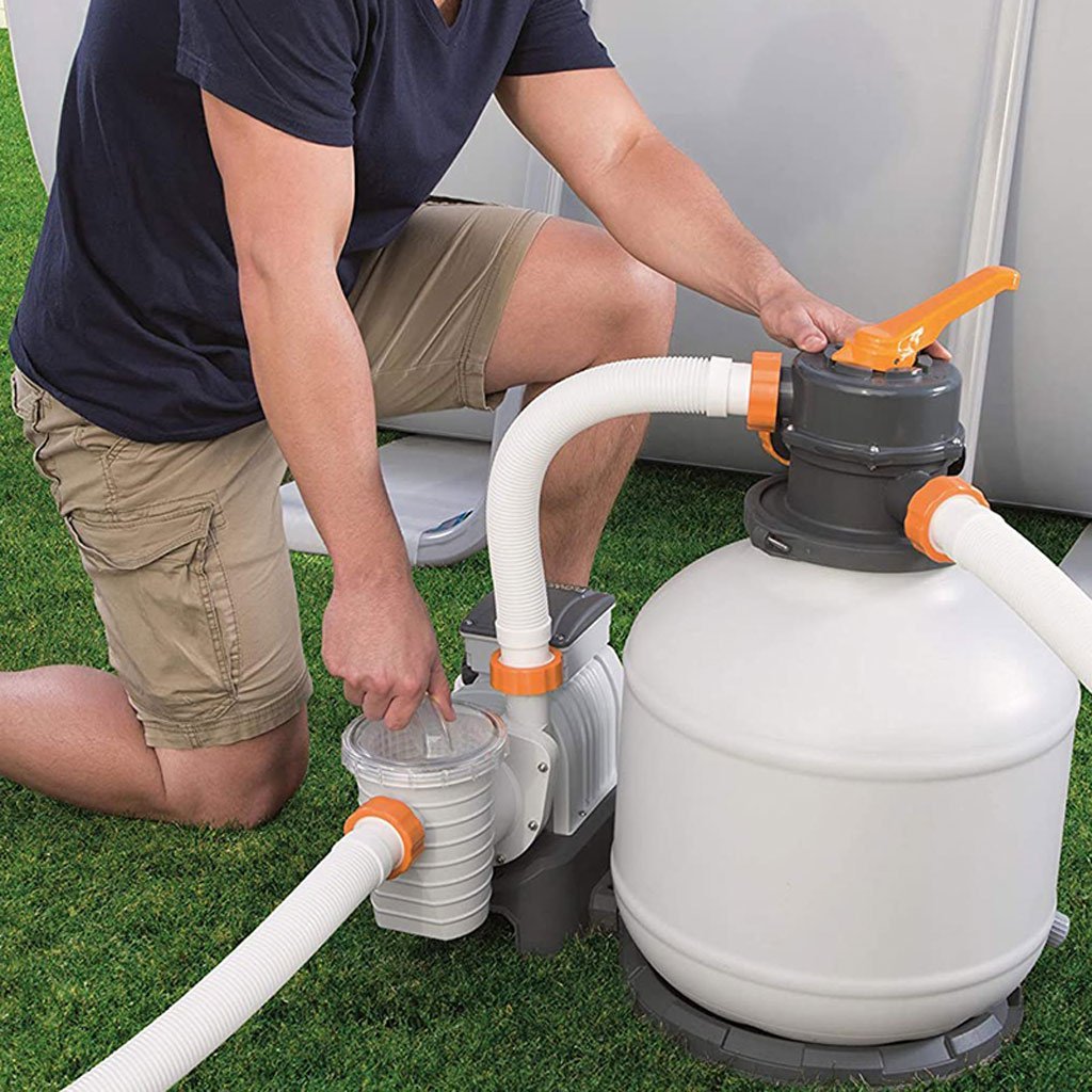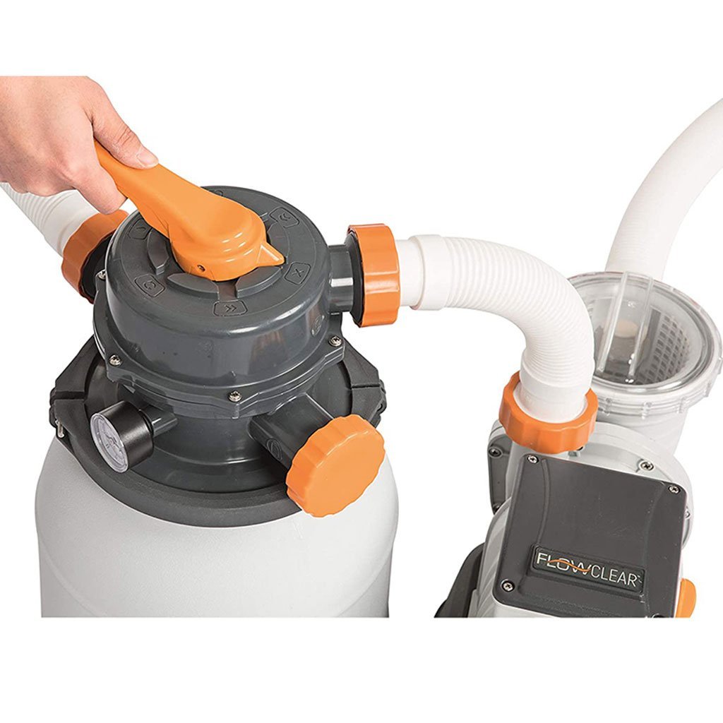 مضخة فلترة بالرمل Flowclear للمسابح فوق سطح الأرضمثالية للمسابح بسعة 1,100 – 42,300 لتر.قدرة ضخ عالية 5,678 لتر/ساعة مع فلترة رملية قوية تحافظ على نقاء الماء.الرمل يُستبدل كل 3 – 5 سنوات بسهولة وبتأثير بيئي أقل من الفلاتر الورقية.تصميم متين: جسم مقاوم للتآكل وخزان بسعة 9 كجم رمل مع سلة فلترة للشوائب الكبيرة لمنع انسداد المضخة وإطالة عمرها.تشغيل سهل: صمام بست وظائف (فلترة، غسيل عكسي، شطف، إعادة تدوير، تفريغ، إيقاف) مع عداد ضغط لقياس حالة الفلترة.يتضمن موزع ChemConnect للحفاظ على مستوى الكلور بشكل مستمر.يأتي جاهزاً للتشغيل مع محولات لصمامات 38 مم وأنابيب بطول 3 م، ويمكن استخدام كرات Bestway بدلاً من الرمل.المواصفات التقنية:الوزن: 12.18 كجمتدفق المضخة: 5,678 لتر/ساعةتدفق النظام: 5,300 لتر/ساعةنوع الرمل: سيليكا 0.45 – 0.85 ممالقدرة: 230 واط – جهد 220-240 فولت