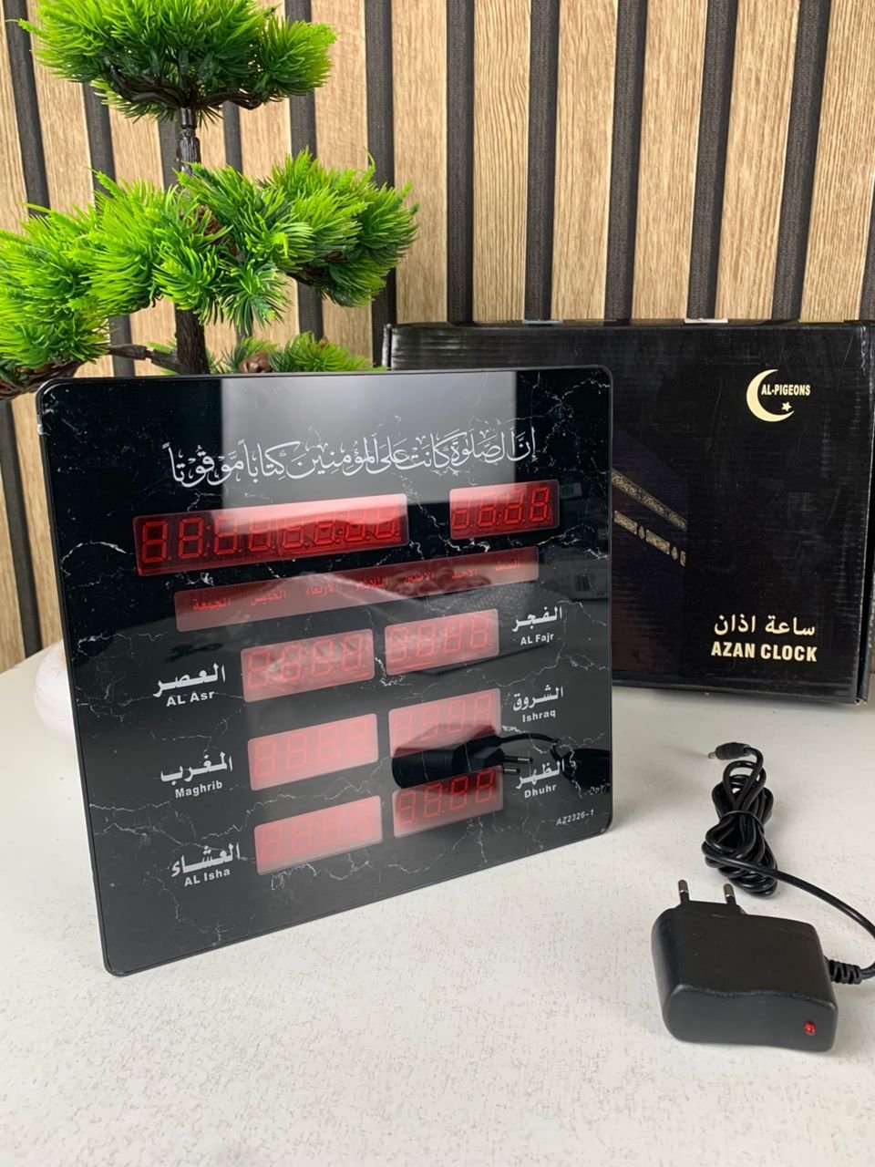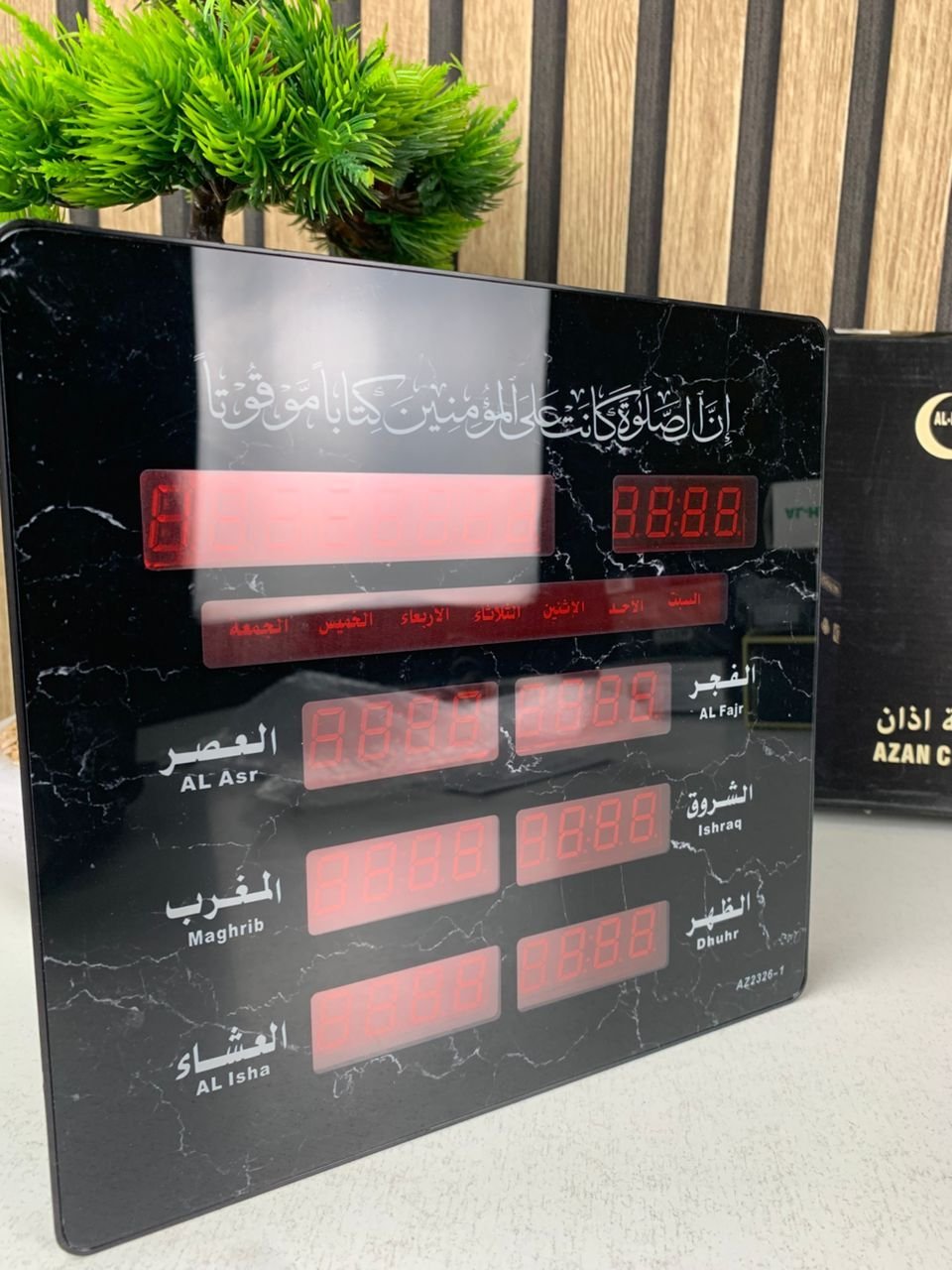 ساعة رقمية إلكترونية لعرض مواقيت الصلاةيتم استخدامها عادة في المساجد أو المنازلتعرض أوقات الصلوات الخمس:الفجرالظهرالعصرالمغربالعشاءتعرض أيضًا توقيت الشروقتصميم فاخرشاشة رقمية LED لعرض المواقيتالمميزات:عرض دقيق لمواقيت الصلاةوضوح عالي بفضل شاشة LEDتصميم أنيق يناسب ديكور المساجد والمنازلسهولة التثبيت والاستخدام