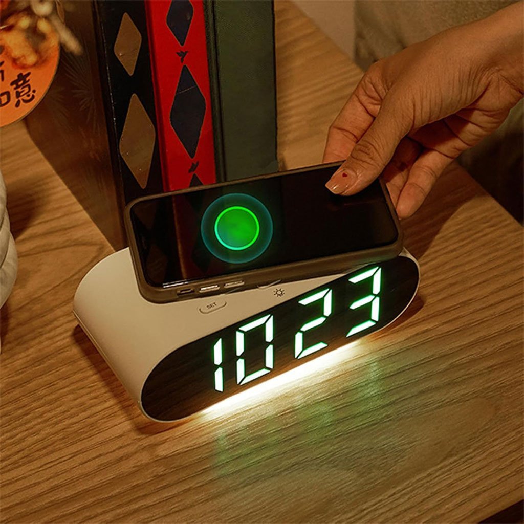 ⏰ ساعة منبّه ذكية مع شحن لاسلكيساعة متعددة الوظائف: تعرض الوقت والتاريخ، مع 3 منبّهات قابلة للتخصيص.شحن لاسلكي مدمج: اشحن هاتفك ببساطة بوضعه على الساعة.تصميم أنيق من البلاستيك ABS الأبيض يضيف لمسة عصرية لأي مكان.مثالية لغرف النوم، المكاتب، وطاولات العمل.تجمع بين التكنولوجيا الحديثة والأسلوب الراقي.
