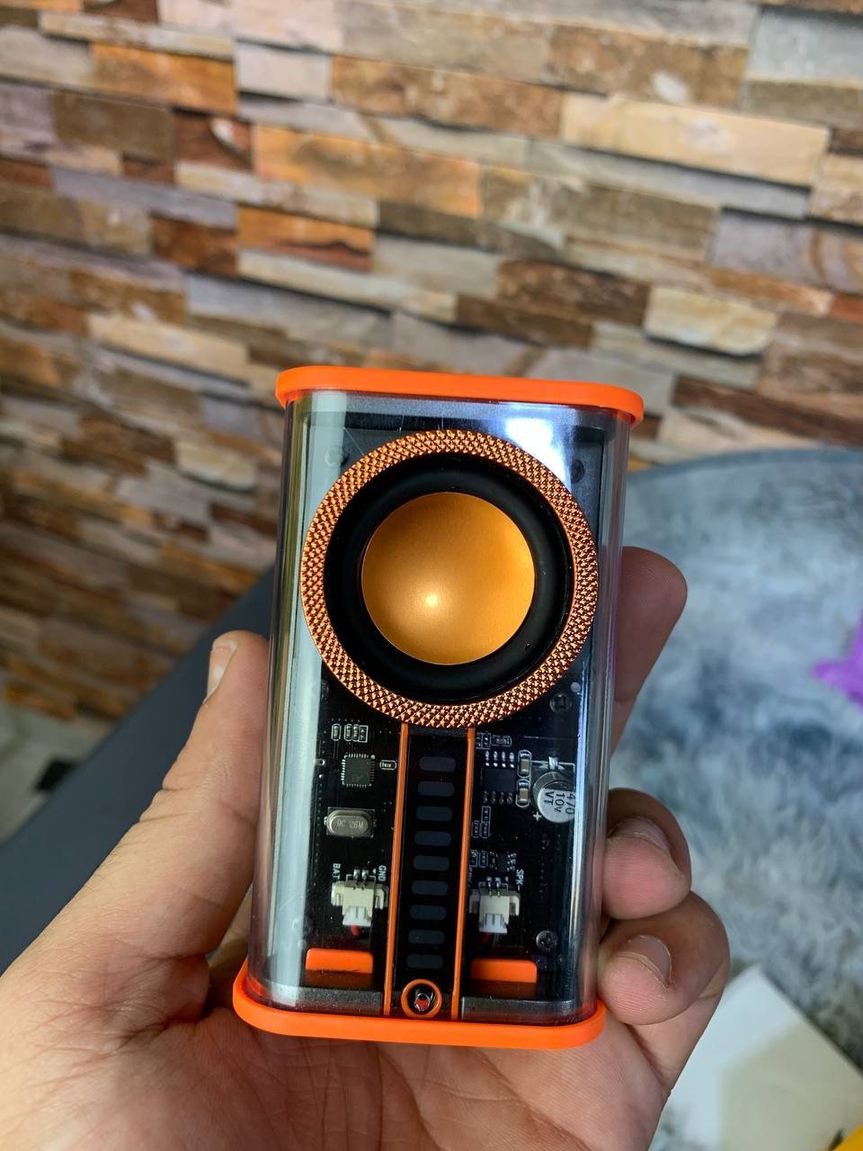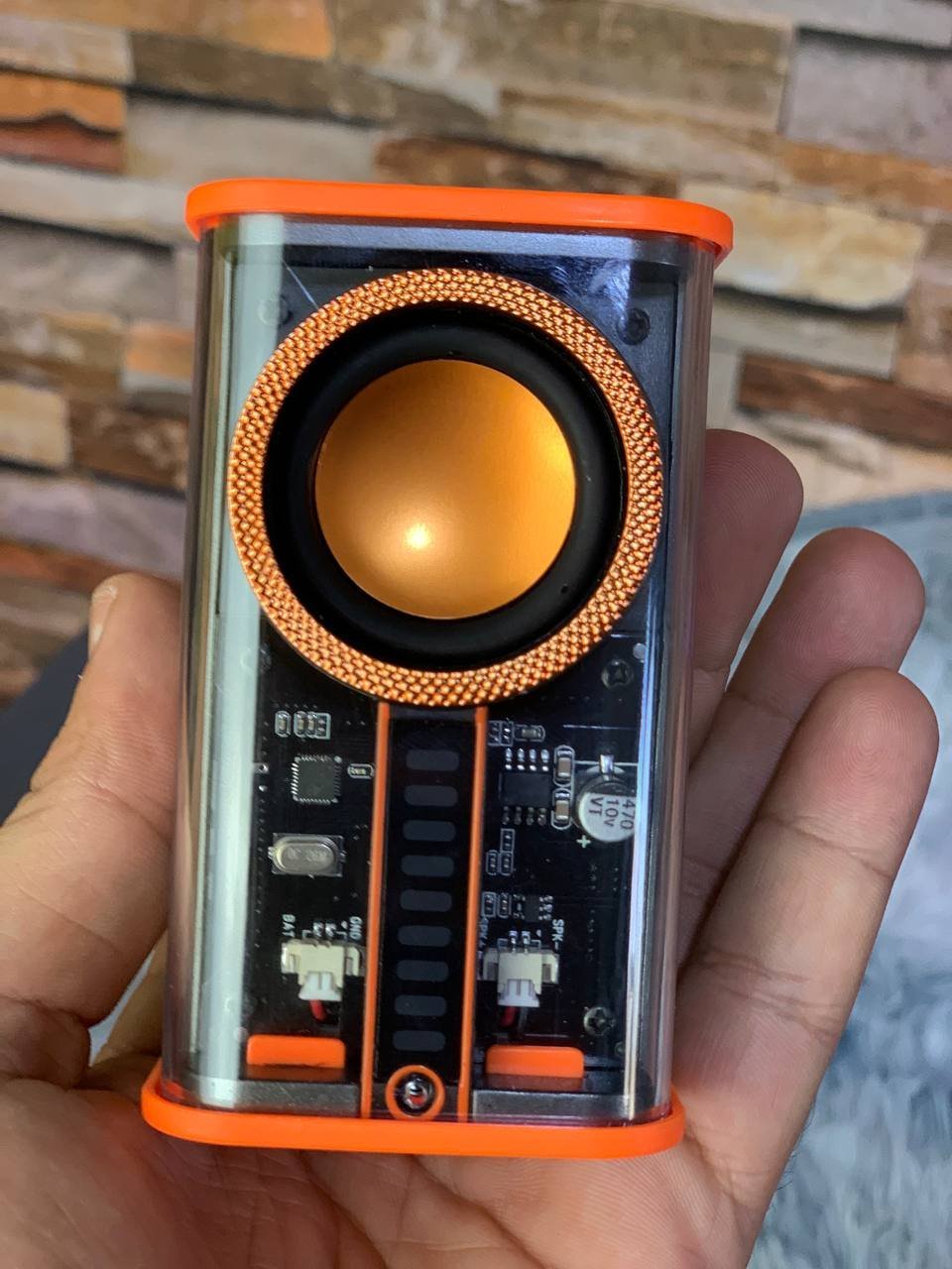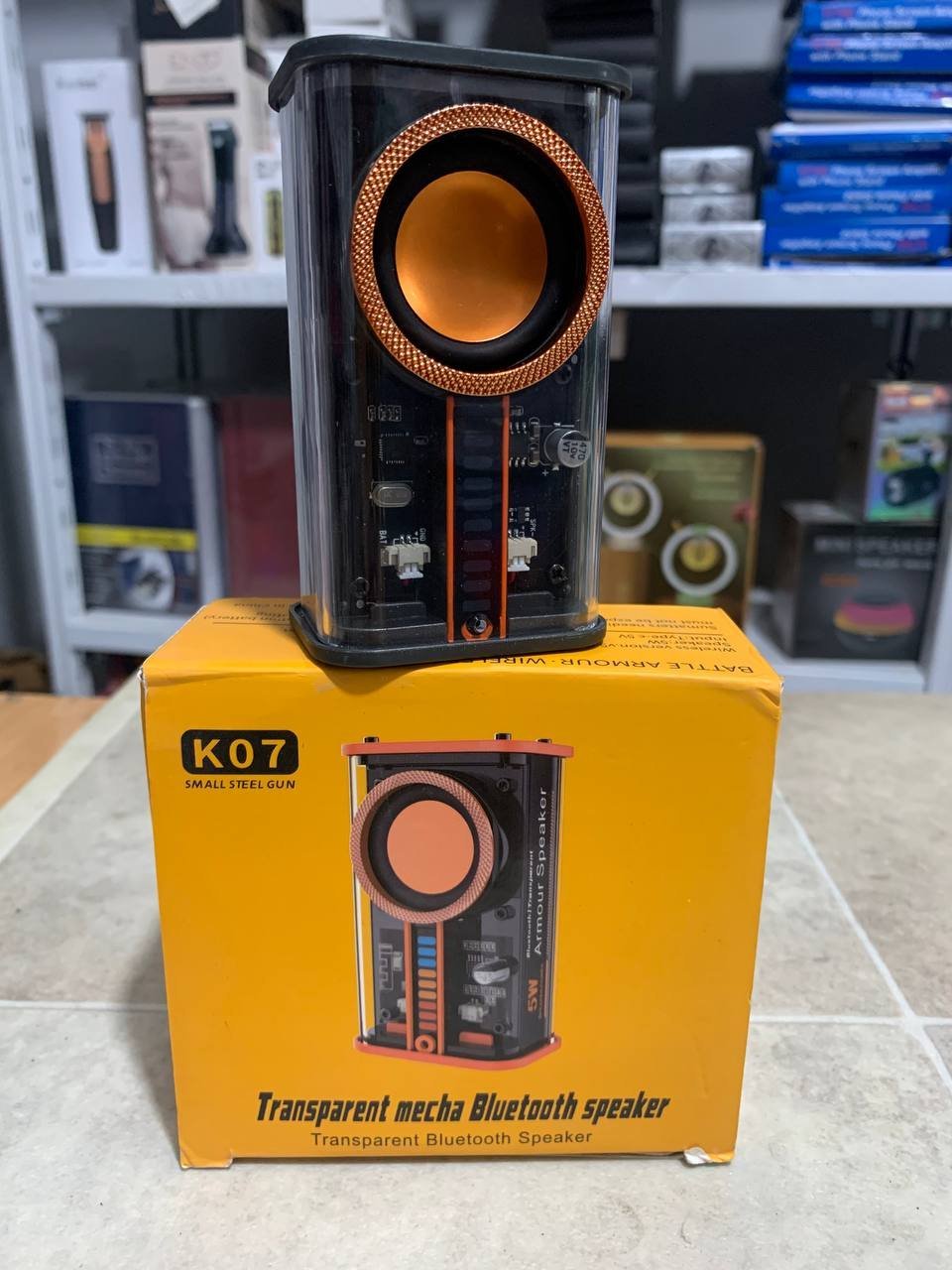سماعات K07 بإضاءة LED وإيقاع صوتي بصرياللون: رمادي برتقاليسعة البطارية: 600 مللي أمبيرمدة التشغيل: 4 ساعات تقريباً (على 70٪ من مستوى الصوت)الوزن: 180 جم (208 جم مع العبوة)المميزات:صوت قوي وواضح مع باس عميق.3 أوضاع إضاءة LED تفاعلية مع الإيقاع.تقنية بلوتوث 5.0 لإشارة قوية ومستقرة حتى 10 أمتار.إمكانية توصيل سماعتين لتجربة صوت ستيريو حقيقية.تصميم شفاف أنيق من الأكريليك والـ ABS.شحن بمنفذ Type-C وزمن شحن 2.5 ساعة تقريباً.