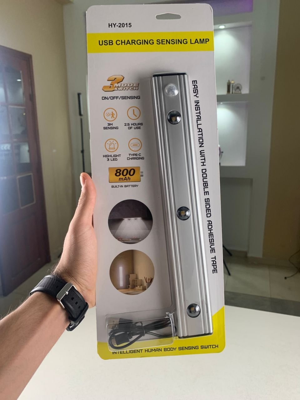 💡 مصباح LED مبتكر مزوّد بمستشعر حركة – تصميم أنيق وأداء عملي في كل ركن من منزلك!استمتع بإضاءة ذكية وجمالية فائقة بفضل مصباح HY-2015، المصمم بأحدث التقنيات لتوفير إضاءة فعالة، قابلة للتعديل، وسهلة التركيب في مختلف أماكن الاستخدام.✨ أبرز الميزات:🌄 تصميم إضاءة فريد “بتأثير التل” يُصدر المصباح شعاعًا منحنيًا يحاكي شكل التلال، مما يضفي لمسة فنية وجمالية خاصة، تختلف حسب مكان التركيب (دولاب، رف، مطبخ، إلخ).🎨 3 ألوان ودرجة سطوع قابلة للتعديلأبيض دافئ (3000K)أبيض محايد (4500K)أبيض بارد (6500K) مع إمكانية التحكم في شدة الإضاءة من 5% حتى 100% (من 100 إلى 300 لومن)، لتناسب مختلف الأوقات والاحتياجات.⚙️ 3 أوضاع ذكية للاستخدام:وضع مستشعر الحركة: يضيء تلقائيًا عند اكتشاف حركة في نطاق 3 أمتار بزاوية 120° في الظلام، ويُطفأ بعد 25 ثانية.وضع التشغيل المستمر: مثالي للاستخدام كمصباح يدوي أو عند الحاجة إلى إضاءة دائمة.وضع الإيقاف الكامل.🔋 بطارية قوية بسعة 800mAh قابلة لإعادة الشحنتعمل من 6 إلى 10 ساعات في وضع الإضاءة المستمرةتعمل من 1 إلى 2 شهر في وضع مستشعر الحركةقابلة للشحن خلال 3 ساعات عبر كابل USB-C (أكثر سرعة وفعالية)🧲 تركيب سهل بدون أدوات مزود بمغناطيسات قوية تلتصق بسهولة بأي سطح معدني، أو يمكن تركيبه على الأسطح غير المعدنية باستخدام لوح معدني لاصق مرفق. مثالي للمطبخ، الخزانة، غرفة النوم، الحمام، الدرج، الممرات، والمرآب.📦 تفاصيل المنتج:✅ الموديل: HY-2015✅ الأبعاد: 30 × 4 × 1.1 سم✅ الوزن: 200 غرام✅ البطارية: ليثيوم بوليمر مدمجة✅ عدد المصابيح: 3✅ الألوان: أبيض بارد✅ الستايل: عصري✅ الاستخدامات: المطبخ – الدولاب – الأدراج – السلم