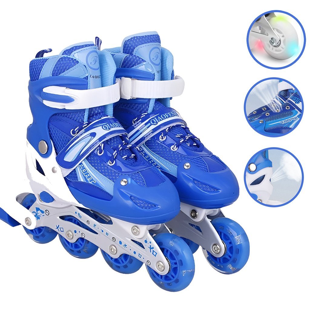 حجم قابل للتعديل: استخدم التصميم المزود بزر ضبط سهل لتحديد المقاس الأنسب لك، فقط اضغط مع الاستمرار على الزر واسحب مقدمة الحذاء لتعديل الحجم مع نمو طفلك.مريح وناعم: مصنوع من مادة PP عالية الجودة، شبكة داخلية، جلد PVC ورغوة EPE لتوفير قيادة سلسة وثابتة وصامتة مع إطار ألمنيوم معزز. عجلات PU مع محامل ABEC 7 مزدوجة الحماية توفر انزلاقًا مريحًا.إضاءة قوس قزح: جميع العجلات تضيء أثناء التزلج، مما يضفي تجربة ممتعة للأطفال بدون بطاريات بفضل الإضاءة الذاتية الملونة.مشبك أمان: مزود بأربطة تقليدية وأشرطة V وحماية ثلاثية بمشبك عالي القوة لتعزيز الأمان، جودة ممتازة ودعم مثالي للمبتدئين دون الحاجة لربط الأربطة يدويًا.هدية مثالية: حذاء تزلج قابل للتعديل يمنح الأطفال توازنًا أفضل وتحكمًا أكبر أثناء اللعب، هدية رائعة لأعياد الميلاد أو العطل أو المناسبات الخاصة.