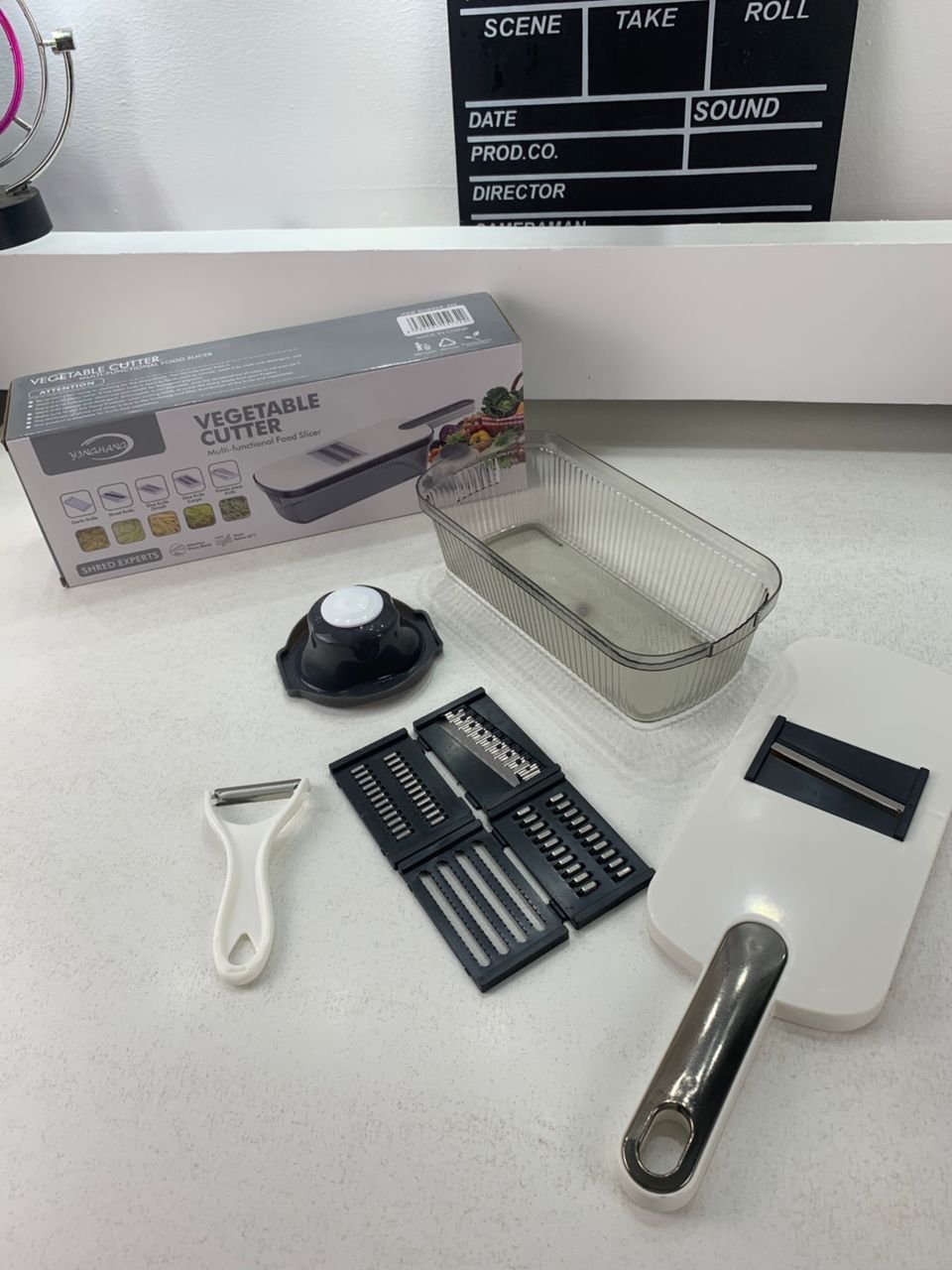 Mandoline à légumes professionnelle avec 5 lames et récipient – قطاعة خضر في المطبخ