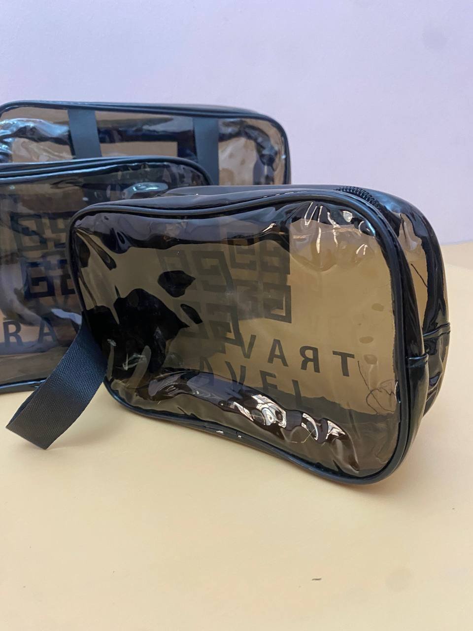حقيبة الغسيل والسفر الشفافة – عملية وعصرية! ✨سعة كبيرة حقيبة واسعة تستوعب جميع مستحضرات التجميل وأدوات العناية الشخصية، مثالية للرحلات الطويلة.مقاومة للماء مصنوعة من نايلون مقاوم للماء لضمان بقاء أدواتك جافة حتى في الأجواء الرطبة.تصميم شفاف عملي يمكنك رؤية محتوى الحقيبة بسهولة لتجد منتجاتك المفضلة بسرعة.متعددة الاستخدامات لا تُستخدم فقط لمستحضرات التجميل، بل أيضًا لتخزين الملحقات الصغيرة مثل فرش الأسنان، الأمشاط أو إكسسوارات الشعر.مواصفات المنتج:الاسم: حقيبة غسيل/حقيبة مكياج للسفرالخامات: جلد PU + PVC مقاوم للماءالمقاسات:كبير: 30×12×21 سممتوسط: 27×10×17 سمصغير: 23×10×13 سم