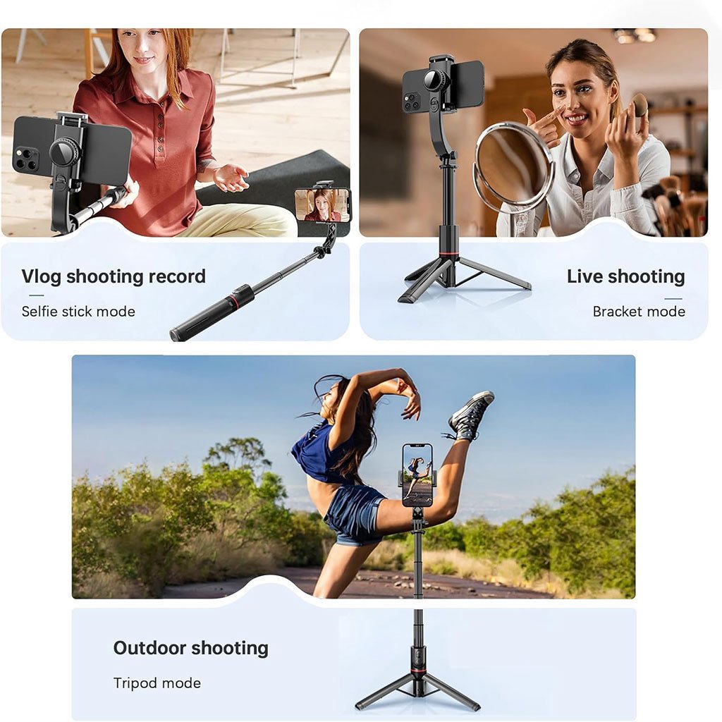 🤳 عصا سيلفي 3 في 1 مع مثبّتتعمل كـ عصا سيلفي، حامل طاولة، ومثبت للتصوير.تقنية مضادة للاهتزاز لضمان لقطات ثابتة أثناء الحركة.حامل هاتف قابل للتعديل يناسب أجهزة من 43 إلى 91 ملم.قضيب ألومنيوم متين قابل للتمدد حتى 70 سم.ريموت بلوتوث للتحكم عن بعد وتدوير المثبت بسهولة.