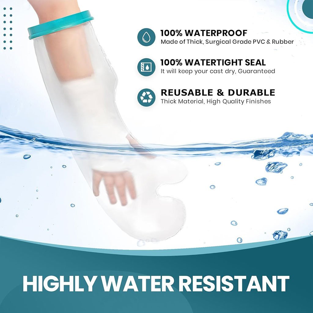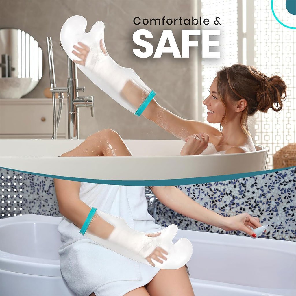 غطاء واقٍ للذراع – مقاوم للماء ومناسب للبالغين🔹 المقاسات : الطول: ‎52 سم – قطر الحلقة: ‎15 سم – محيط الذراع المناسب: من ‎25 إلى ‎40 سم. مناسب لمعظم الرجال والنساء البالغين.🔹 المواد : هذا الغطاء مصنوع من PVC عالي الجودة، وهو مادة آمنة طبيًا. الغطاء عديم الرائحة والطعم، متين ويدوم طويلاً.🔹 الصحة والحماية : الغطاء مقاوم للماء بنسبة ‎100% لحماية الجزء المصاب. يمنع بشكل فعّال تسرب الماء إلى المنطقة المتأثرة أثناء الاستحمام أو الأنشطة المائية الأخرى. مناسب للمرضى الذين لديهم قسطرة (PICC line)، ضمادات أو مشاكل جلدية.🔹 طريقة الاستخدام : قبل الاستحمام، يُفضل أن يساعدك أحد أفراد العائلة في فتح الحلقة المرنة الخاصة بالغطاء المقاوم للماء، ثم إدخال الطرف المصاب ببطء داخل الغطاء لتفادي ملامسة المنطقة المصابة.