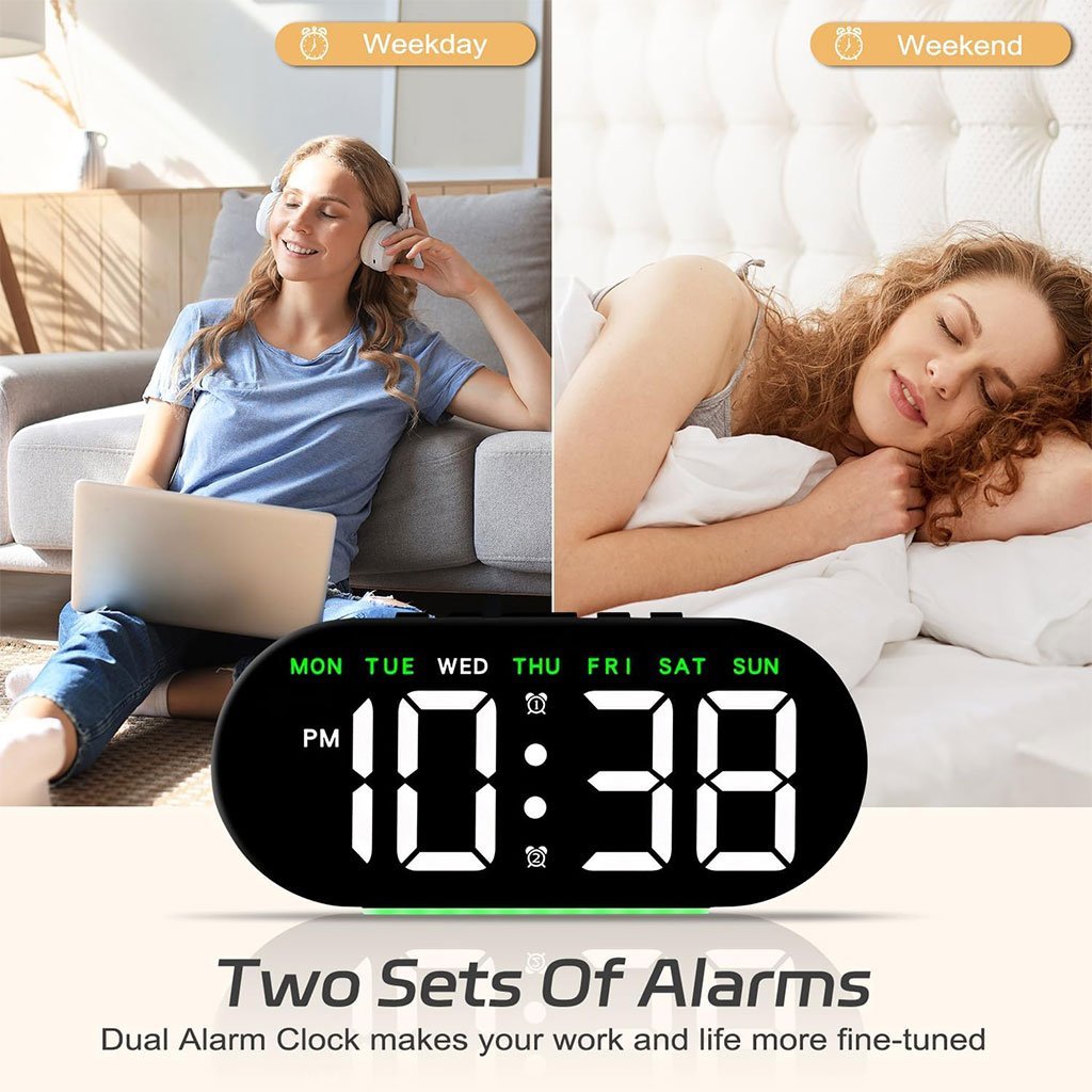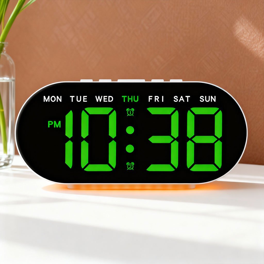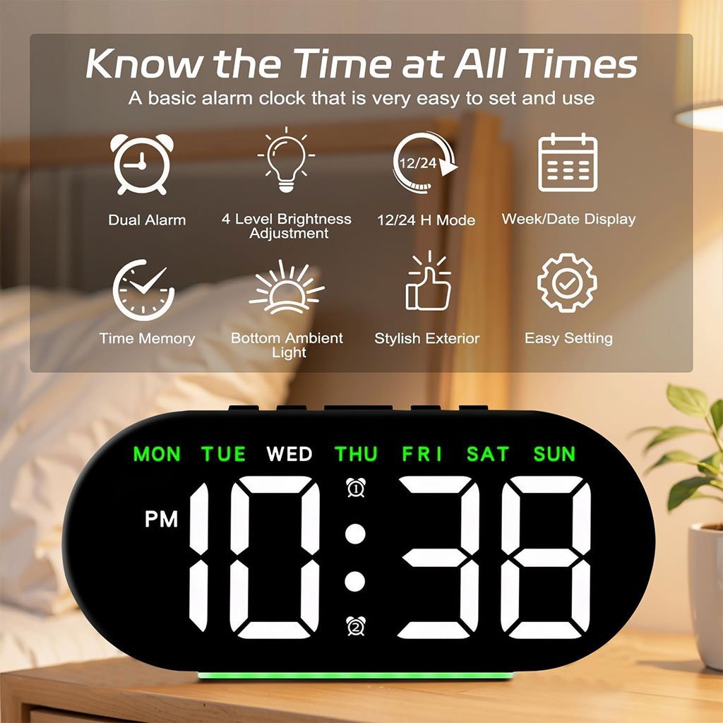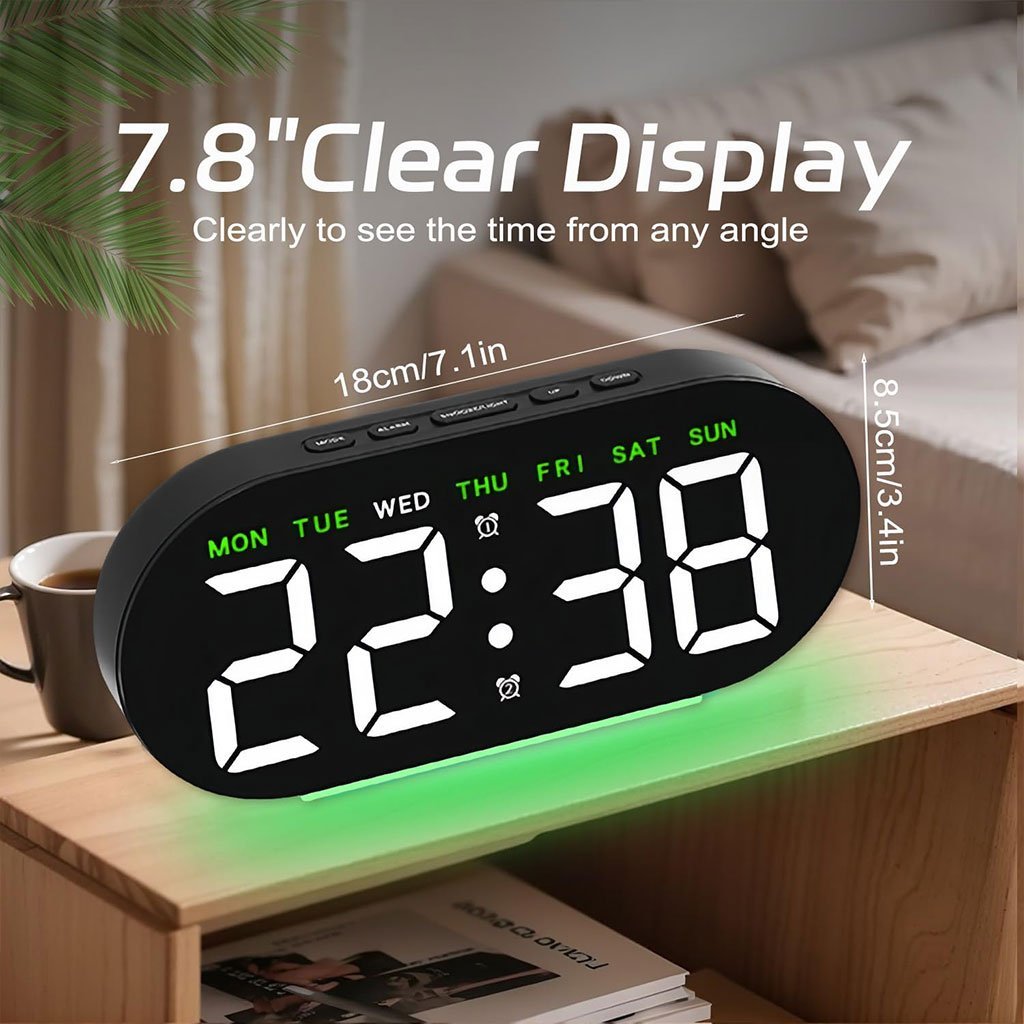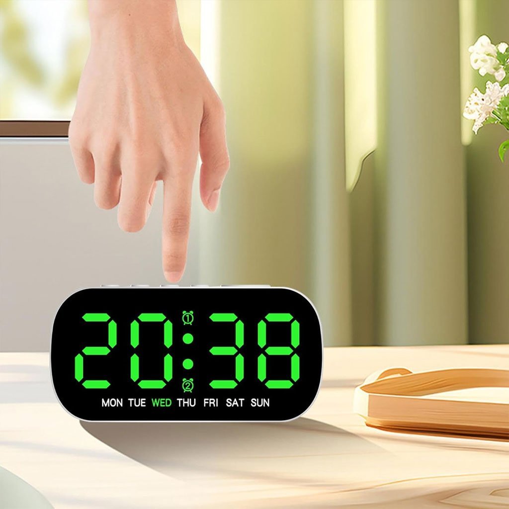 ⏰ ساعة منبّه رقمية بشاشة LED كبيرة 7.8 بوصة🔹 شاشة كبيرة وواضحة تأتي ساعة المنبّه بشاشة LED عالية التباين بحجم 7.8 بوصة، سهلة القراءة من مسافة بعيدة. تعرض في نفس الوقت اليوم، التاريخ، الساعة والمنبّه. يتيح الزر العلوي عرض درجة حرارة الغرفة والتبديل بين نظام 12 ساعة و24 ساعة. 📌 ملاحظة: تعمل بالكهرباء عبر منفذ USB (يلزم توصيلها بمصدر طاقة).🔹 منبّه مزدوج مع خاصية الغفوة (Snooze) تدعم الساعة نظام منبّه مزدوج يميز تلقائيًا بين أيام الأسبوع وعطلة نهاية الأسبوع.وضع “النشاط” لأيام العملوضع “الراحة” لعطلة نهاية الأسبوع يمكنك تخصيص أوقات الاستيقاظ بسهولة. اضغط على زر SNOOZE/LIGHT لتفعيل الغفوة، وعلى أي زر آخر لإيقافها.🔹 تحكم في سطوع الشاشة (4 مستويات) توفر شاشة الساعة 4 درجات سطوع قابلة للتعديل يدويًا: 100% – 75% – 50% – إيقاف الإضاءة لتناسب الإضاءة المحيطة وتوفر راحة مثالية للعين، خصوصًا أثناء الليل.🔹 إضاءة محيطية مريحة للعين مزودة بإضاءة محيطية بثلاثة مستويات سطوع، يمكن التبديل بينها بسهولة بضغطة واحدة. من إضاءة قوية إلى خافتة، ومن دافئة إلى ناعمة، لتناسب جميع الأجواء. مثالية للاستخدام في غرف النوم، الصالونات، المكاتب، غرف الطلبة وغيرها.🔹 وظيفة الذاكرة الذكية تحتوي الساعة على خاصية حفظ الإعدادات. بمجرد تركيب 3 بطاريات AAA (غير مرفقة)، ستحتفظ الساعة بجميع الإعدادات في حال انقطاع الكهرباء، دون الحاجة لإعادة الضبط.🔹 سهلة الاستخدام ومناسبة للجميع تصميم أنيق يضيف لمسة جمالية لأي مكان. مناسبة للأطفال، كبار السن، والشركاء، وتُعد فكرة هدية مثالية 🎁 بفضل زر التحكم العلوي الواحد، يمكن لأي شخص استخدامها دون تعقيد أو خبرة تقنية.