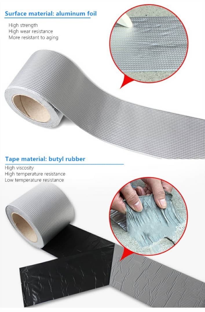 شريط لاصق مانع للتسرب (شريط بوتيل):المادة: رقائق ألومنيوم + مادة بوتيلمقاوم للماء ودرجات الحرارة العالية (-40° حتى 120°)معدل استطالة: 1000%عمر افتراضي: 30 سنةالاستخدامات:إصلاح الثقوب في الصفائح المعدنيةترميم الشقوق الجداريةسد الفواصل المعدنيةترميم شقوق الأسمنتإصلاح الأضرار السطحيةمعالجة تسرب المياهمقاومة الحرارة العاليةديكورات المبانيأعمال العزلالحماية من التآكل للأنابيبالمشاريع الهندسيةاستخدامات إضافية متعددةالمقاس: 5 م × 10 سم