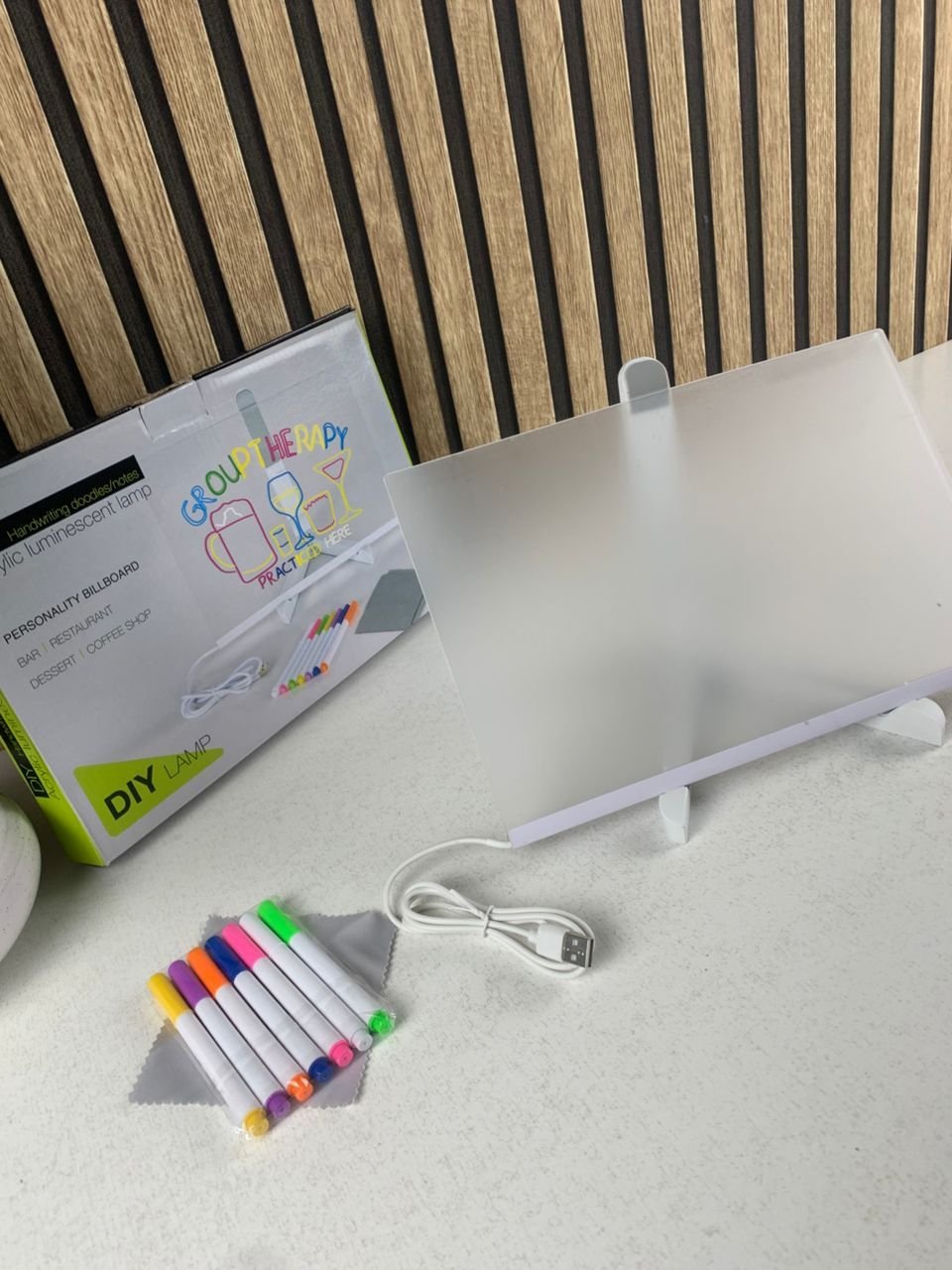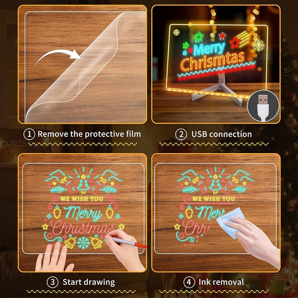 تركيز أكبر ومتعة في الاستخدامعلى عكس الألواح التقليدية، تساعد هذه اللوحة المضيئة الأطفال والكبار على التركيز أكثر على ما هو مكتوب. يمكن استخدامها للرسم، للتخطيط اليومي، أو لترك رسائل لطيفة ومشجعة لأطفالك أو لأفراد العائلة.قابلة لإعادة الاستخدام مع أقلام ملوّنةتأتي اللوحة مع 7 أقلام بألوان مختلفة وقطعتين قماش للمسح. الكتابة عليها سلسة وواضحة، والحبر يجف بسرعة ويمكن مسحه بسهولة. في حال جفّ الحبر لفترة طويلة، يكفي مسحه بقطعة قماش قطنية مبللة بلطف.تصميم مضيء أنيق وعصريمصنوعة من أكريليك شفاف عالي الجودة مع إضاءة LED تمنح تأثيرًا بصريًا جميلًا ومريحًا للعين. تصميمها خفيف وأنيق بدون ترك آثار على السطح، ما يجعلها مناسبة للمكتب، المنزل أو أي مساحة عمل.استخدامات متعددة في مكان واحديمكن استعمالها كـ:لوحة مهام يوميةلوحة ملاحظات أو تذكيرلوحة رسم أو تخطيطلوحة قائمة لمقهىلوحة تحفيزية أو تعليميةدفتر ملاحظات مع تقويمحل عملي يلبي مختلف الاحتياجات اليومية.ملاحظات مهمة للاستخداميرجى إزالة الغلاف الواقي المزدوج عن اللوح الأكريليكي قبل الاستعمال. اللوحة مزودة بحامل قابل للتعديل، مما يسمح بوضعها بالزاوية المناسبة حسب راحتك.لوحة واحدة… تنظيم أفضل، تواصل أجمل، ولمسة عصرية مضيئة في كل مكان.