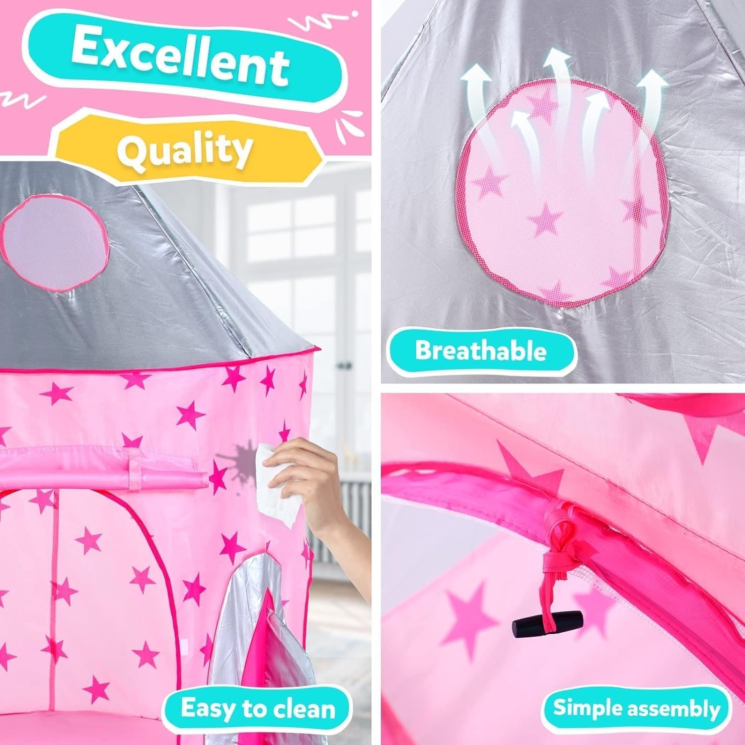 نظام لعب 3 في 1 متكامل: تتكون من خيمة قلعة (Château)، نفق تسلق طويل، وخيمة مكعب. يمكن للأطفال استخدام كل قطعة على حدة أو ربطها معاً لتشكيل مسار مغامرات متكامل.تطوير المهارات الحركية والذكاء: صُممت لتشجيع الأطفال على الزحف، التسلق، والحركة، مما يساعد على تطوير مهاراتهم الحركية الدقيقة وزيادة نشاطهم البدني والذهني بعيداً عن الشاشات.تصميم سحري ومبهج: تتميز بسقف مزين بـ نجوم مضيئة ورسومات كرتونية ملونة على الجدران، مما يخلق بيئة لعب محفزة للخيال وتمنح الأطفال شعوراً بالسعادة والخصوصية.تهوية ممتازة وأمان: مزودة بـ نوافذ شبكية تضمن تدفق الهواء المنعش داخل الخيمة وتسمح للأهل بمراقبة أطفالهم أثناء اللعب. كما تحتوي الأبواب على ستائر قابلة للطي والفتح بسهولة.جودة عالية وأمان تام: مصنوعة من مواد متينة، سميكة، وعديمة الرائحة. القماش غير سام وآمن تماماً لبشرة الأطفال، مما يضمن سنوات من اللعب الآمن.تركيب “بوب-آب” (Pop-Up) سريع: تنفتح الخيمة وتتخذ شكلها في ثوانٍ بمجرد إخراجها من الحقيبة، مع أعمدة دعم من الألياف (Fibre) لضمان استقرارها وثباتها أثناء لعب الأطفال.حقيبة تنقل مجانية: تأتي مع حقيبة حمل عملية، مما يجعل من السهل طيها وحملها معكِ في النزهات، زيارات العائلة، أو حتى تخزينها تحت السرير دون شغل مساحة.الأبعاد في الصورة.ملاحظة الكرات البلاستيكية غير مدمجة مع المنتج.